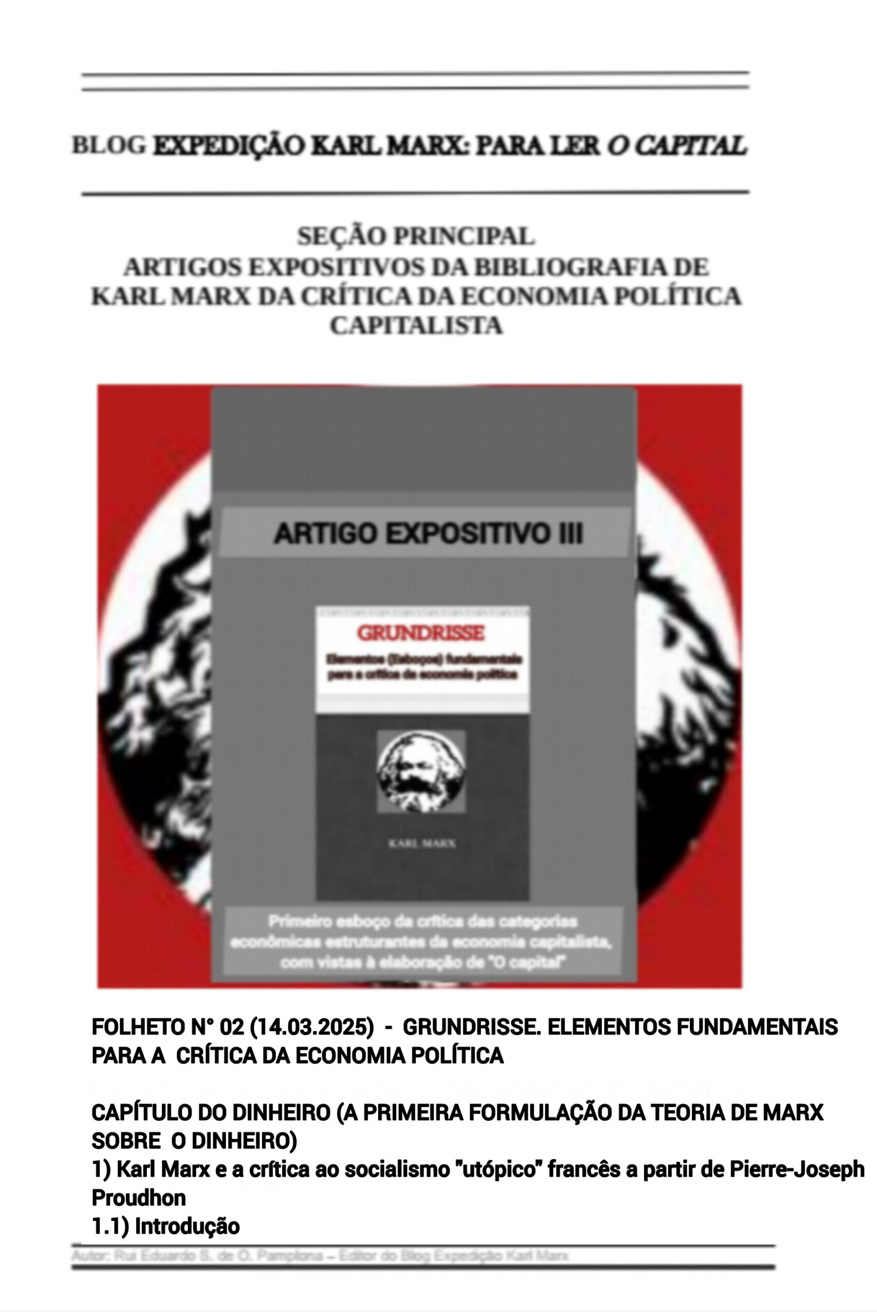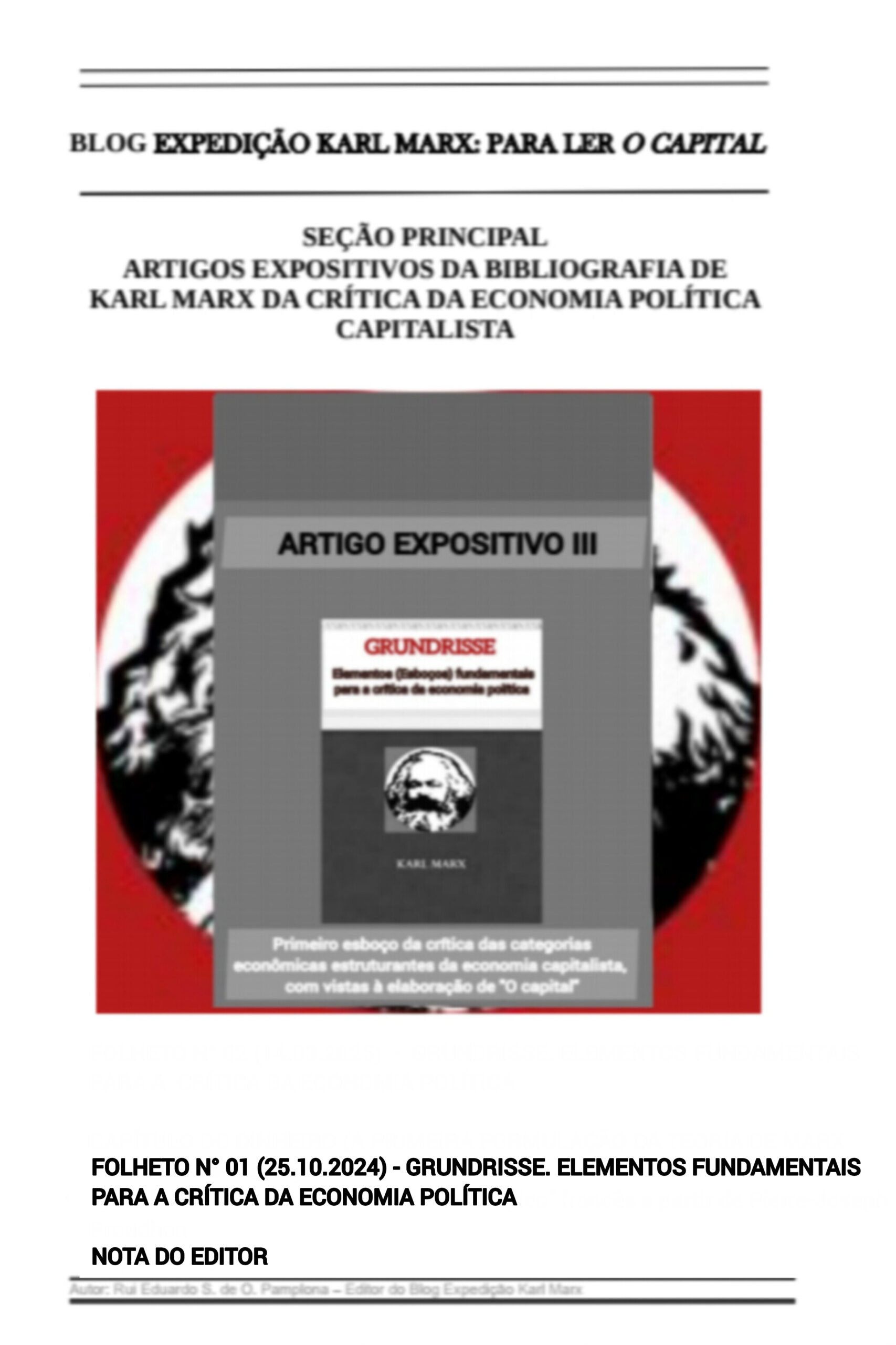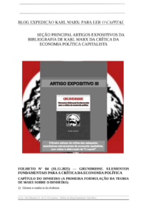 - Folheto nº 01 (05.11.2020) e Folheto nº 02 (05.01.2021) – PARTE I: INTRODUÇÃO DE GÊNESE – Capítulo 1: Como nasceram os Grundrisse / Capítulo 2: A estrutura da obra [O capital] de Marx / Capítulo 3: Karl Marx e o problema do valor de uso na economia política √